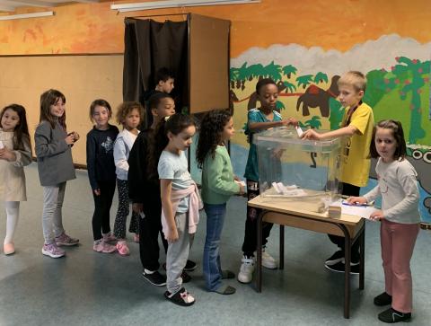 Puis, tous les élèves se sont rendus dans le préau transformé en bureau de vote et où se trouvaient un isoloir et une urne prêtés par la mairie.